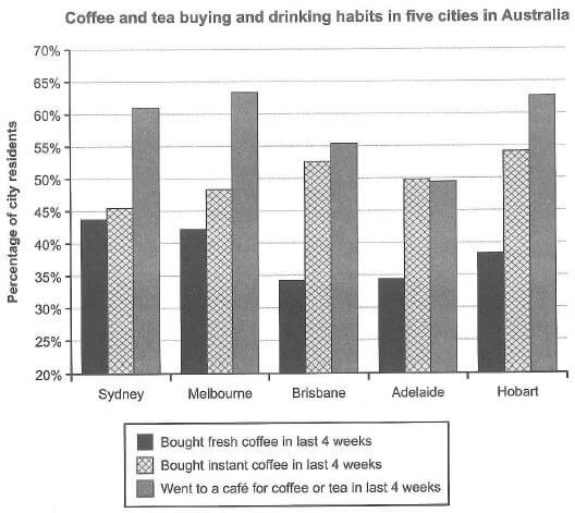 The chart below shows the results of a survey about people’s coffee and tea buying and drinking habits in five Australian cities.
