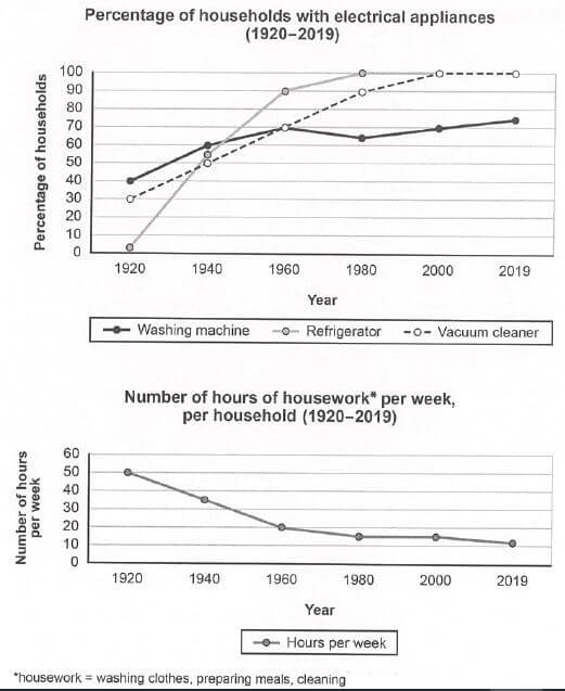 The charts below show the changes in ownership of electrical appliances and amount of time spent doing housework in households in one country between 1920 and 2019.