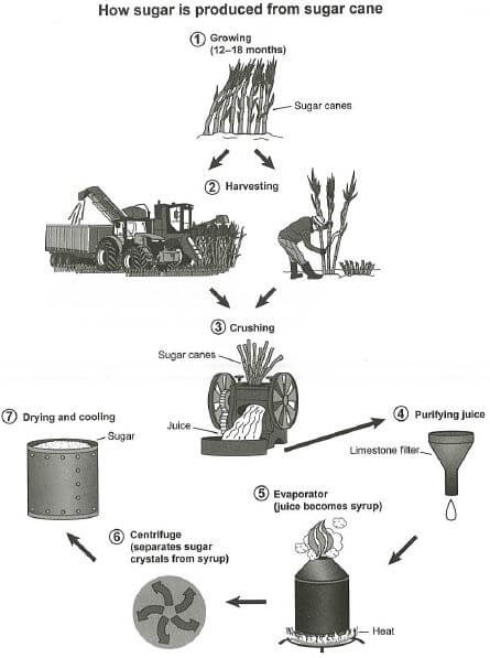 The diagram below shows the manufacturing process for making sugar from sugar cane.