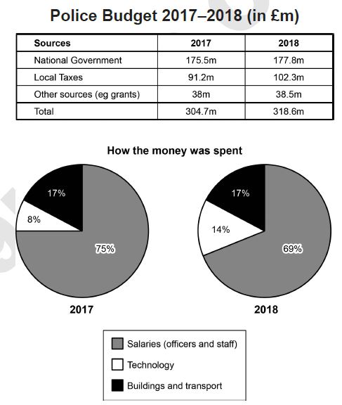 The table and charts below give information on the police budget for 2017 and 2018 in one area of Britain. The table shows where the money came from and the charts show how it was distributed.