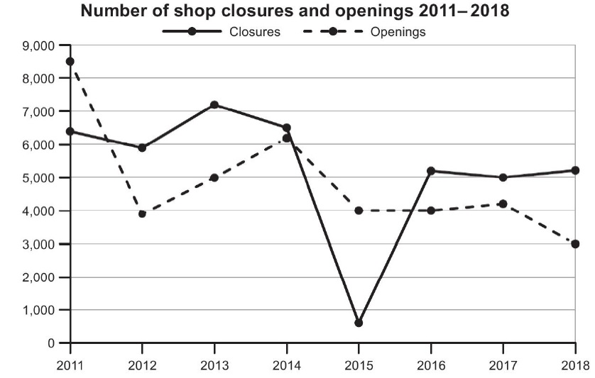 The graph below shows the number of shops that closed and the number of new shops that opened in one country between 2011 and 2018.