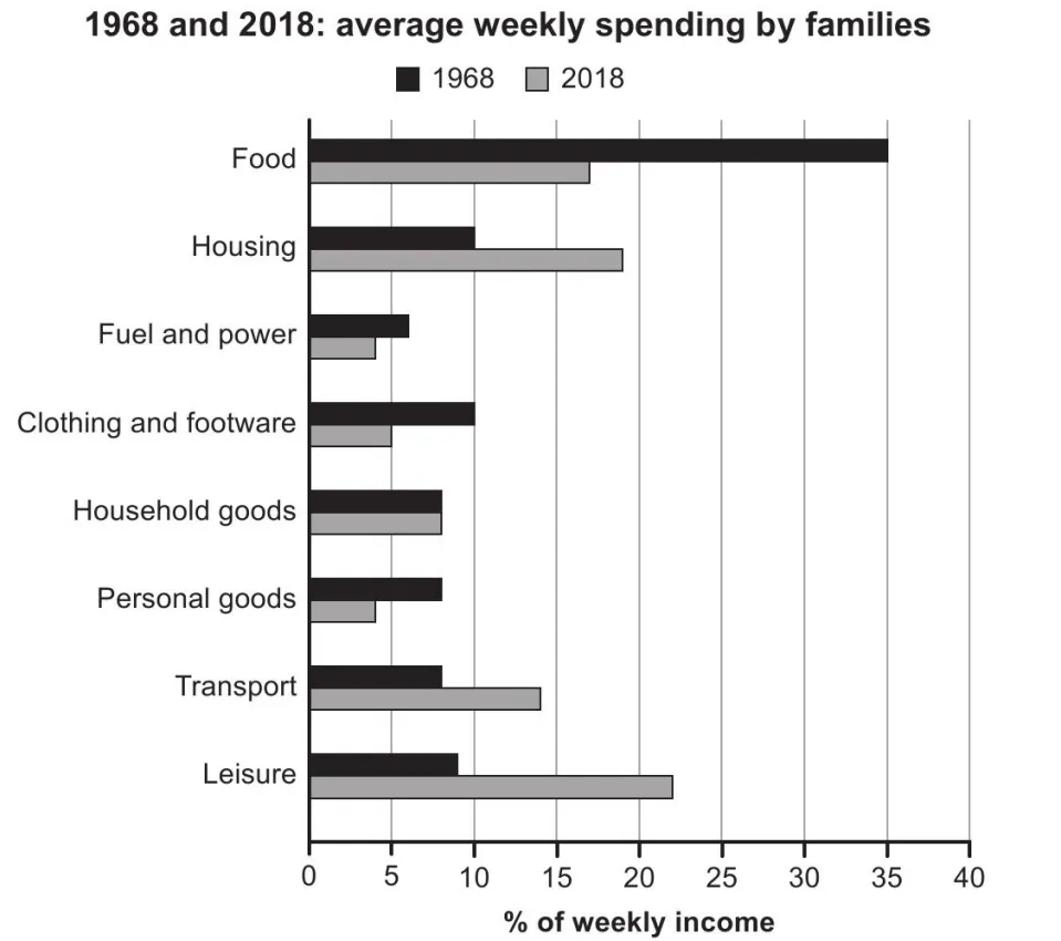 The chart below gives information about how families in one country spent their weekly income in 1968 and in 2018.